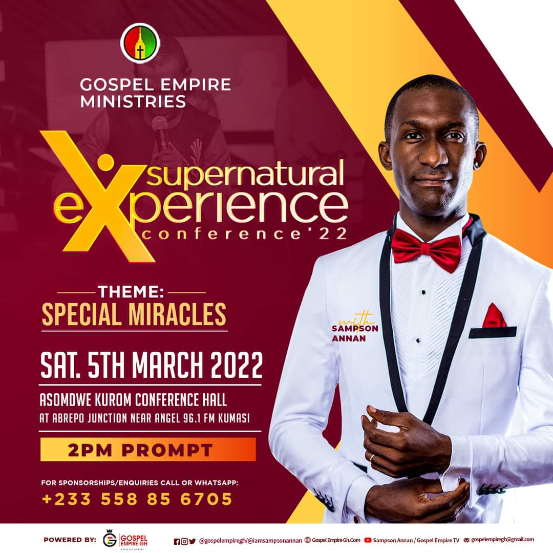 The “Supernatural Experience” Conference, a rip-roaring prophetic, healing and deliverance hybrid event hosted by the Prophetic Paragon, Sampson Annan, the Founder / CEO of Gospel Empire Ministries (GEM) & Gospel Empire Gh, is set to hold on Saturday March 5th, 2022, starting at 2pm.